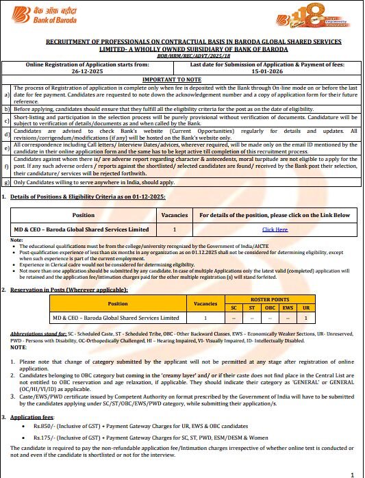 The Bank of Baroda is hiring for the positions of CEO and MD in 2025. Any graduate with an MBA or PGDM is eligible to apply online. The online application will be available from December 26, 2025, to January 15, 2026. The Bank of Baroda website, bankofbaroda.bank.in, is where the aspirant must submit an online application. Roles in Bank Management